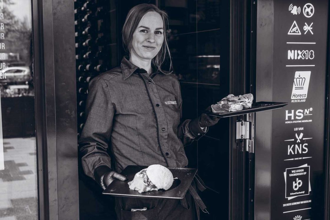 De zwarte kamado’s voor de deur nodigen uit voor een proeverij. “We geven regelmatig een demonstratie op The Bastard. Wij verkopen goed vlees, maar wij zijn niet de enigen die goed vlees verkopen. Wij zijn aardig, maar we zijn niet de enigen die aardig zijn. De Vleeschmeester onderscheidt zich vooral op dit vlak. Wij delen onze kennis. Wat heb ik eraan om een goede biefstuk te verkopen als de klant niet weet hoe hij of zij deze moet klaarmaken? Wagyu is prachtig vlees maar zelfs prachtig vlees kun je in de pan verzieken voor het te lang door te bakken of door het met de spiervezels mee te snijden in plaats haaks op de draad. Mijn tip? Gaar rundvlees eerst op lage temperatuur, circa 60 graden, in de oven en bak het daarna pas in de pan. Met zonnebloemolie of roomboter? Roomboter heeft mijn voorkeur, maar dat is persoonlijk.” Vleeschmeester gaat verder dan het geven van bereidingsadviezen. “Tijdens onze workshops leer je hoe je een rund of een lam uitbeent.”